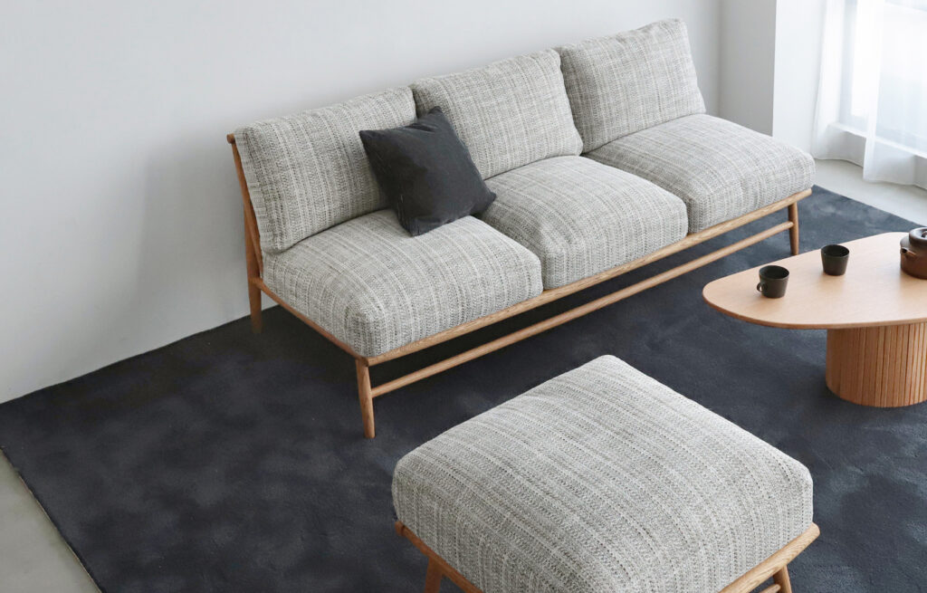 モモ ナチュラルのソファは豊富なファブリックの中から張り地を選べるからこそ、華奢なウッドフレームを生かして、遊びのあるコーディネートも愉しむことができます。